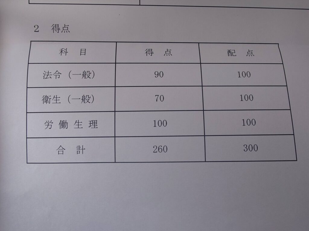 衛生管理者試験については合格通知は来たものの、点数の記載はなかったため、点数がどれくらい取れたのかの開示を行った。