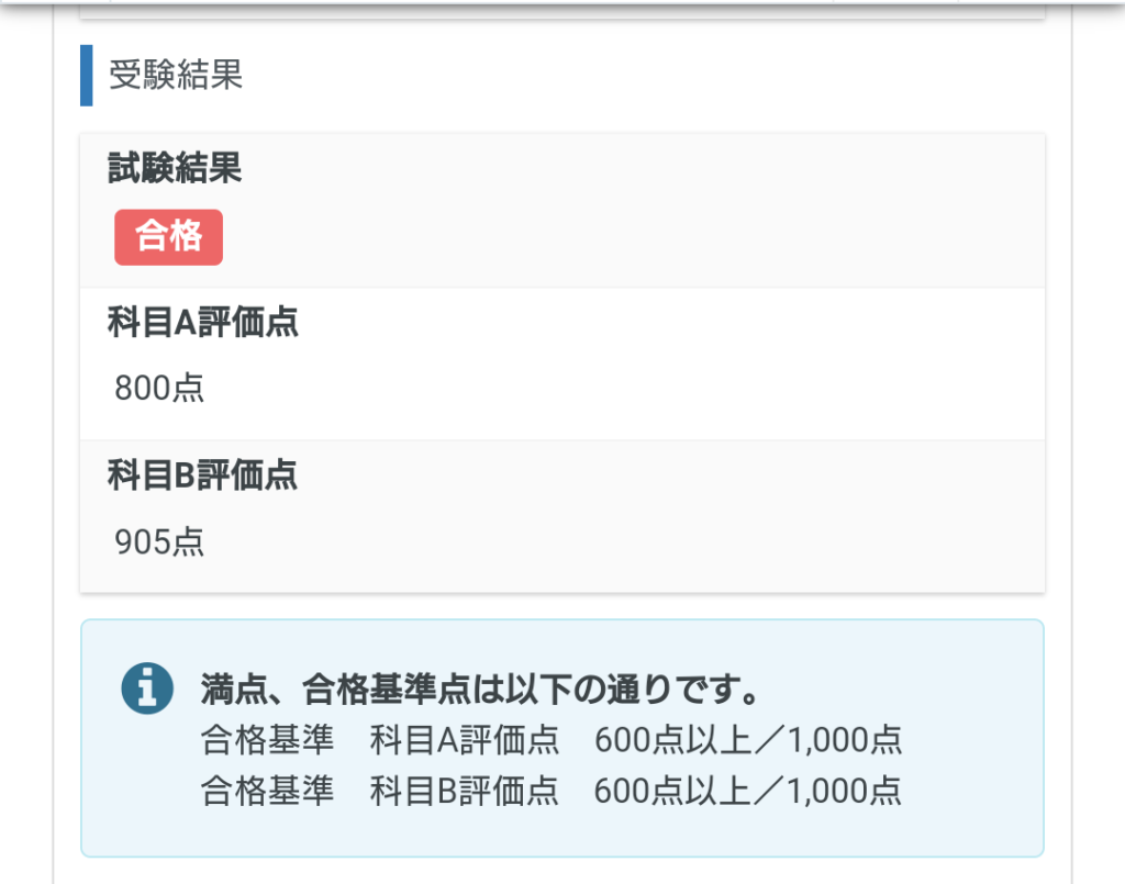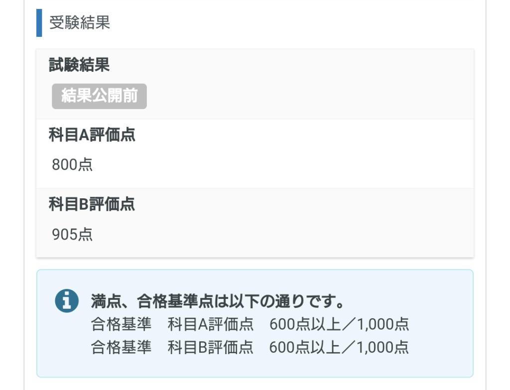 合否の結果はまだ出てないが、点数は科目Aが800/1,000点、科目Bが905/1,000点だった。