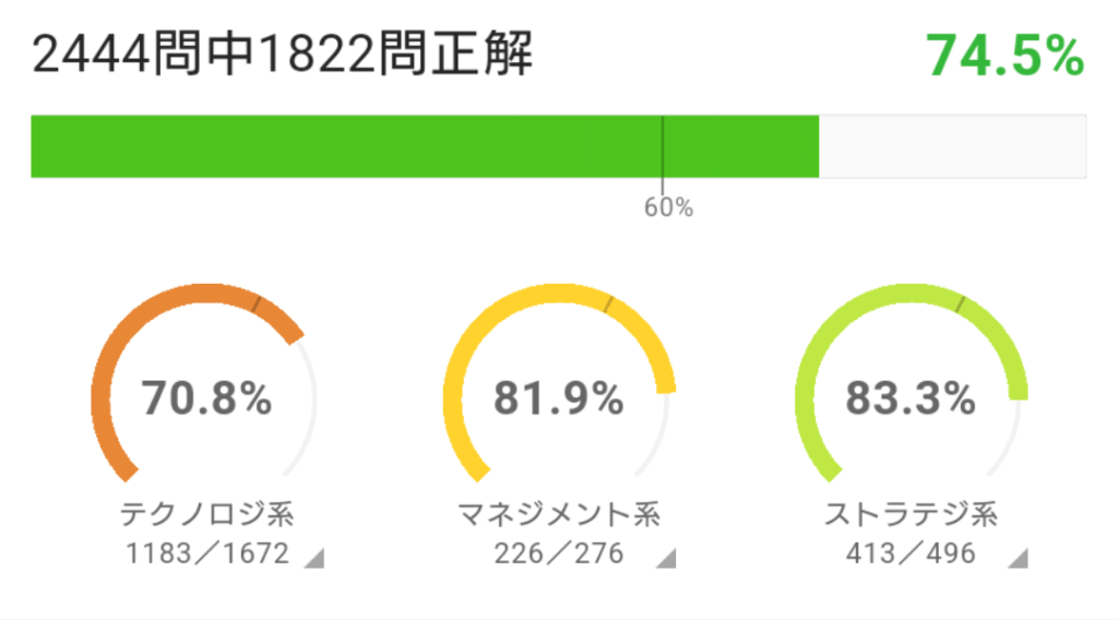 内訳はテクノロジ系が36/50(72.0%)、マネジメント系が9/10(90.0%)、ストラテジ系が19/20(95.0%)という感じ。