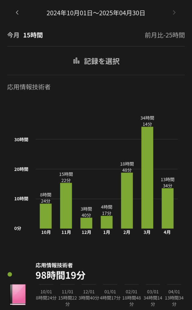 10月から4月まで7ヶ月かけて、合計98時間勉強した。