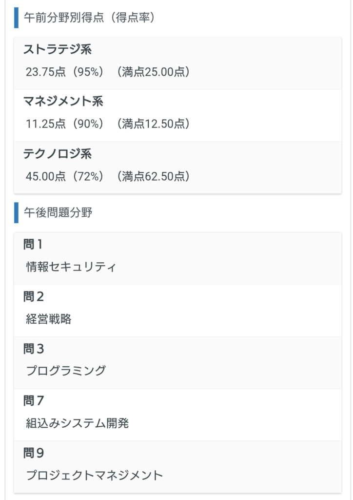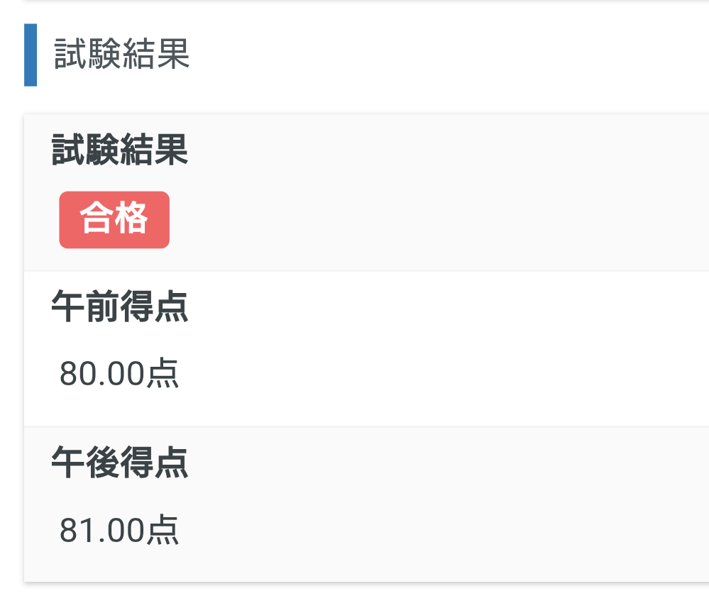 合格点が午前・午後とも60点以上なので、比較的余裕を持って合格していた。感覚的には午後落ちたなと思っていたので、驚きの結果。