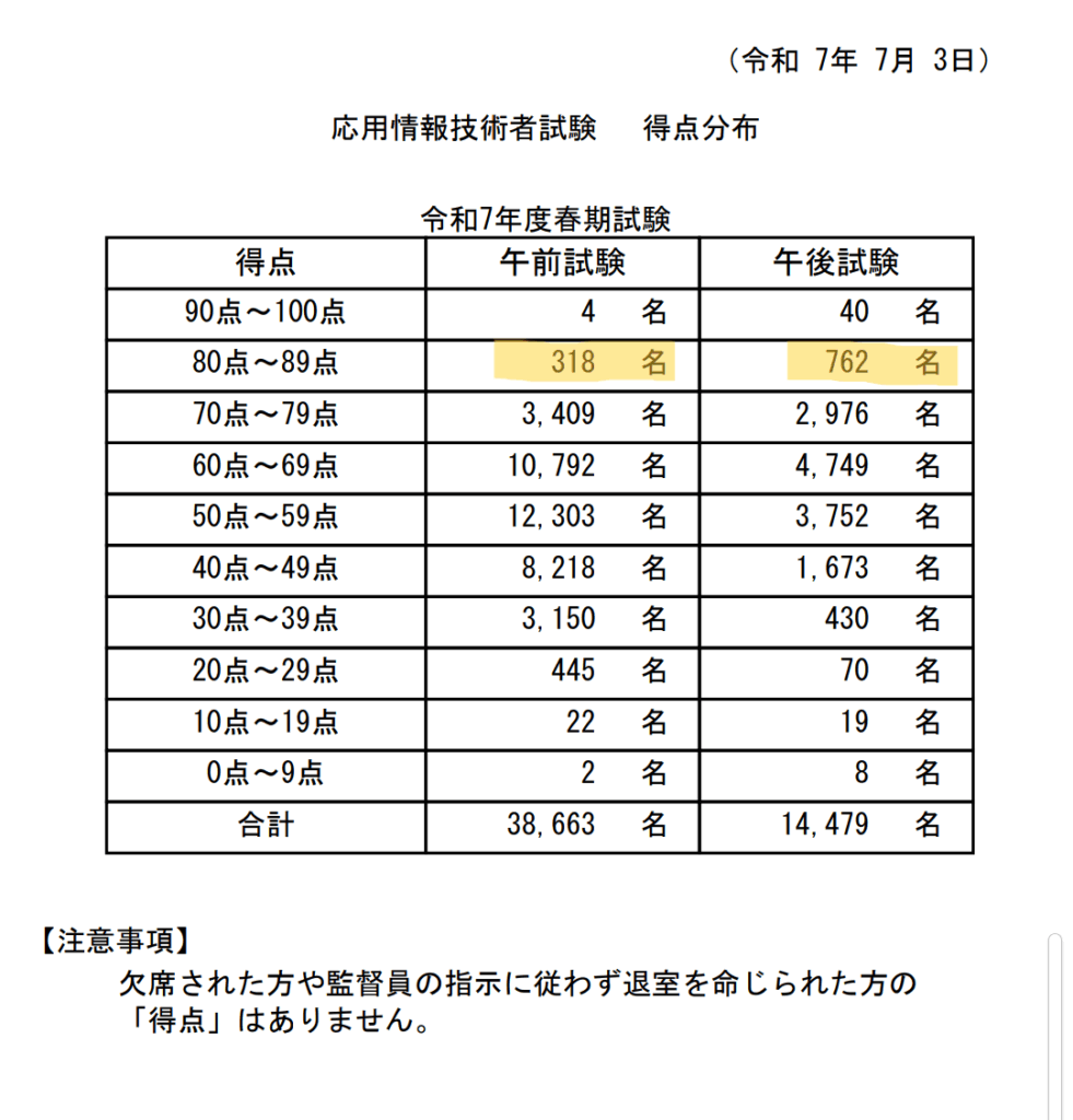 応用情報技術者試験では、自分の順位の詳細を知ることはできないが、合格発表から2~3ヶ月程度までの間(今回の場合は9/30まで)得点(評価ランク)分布が公表されている。今回(令和7年度春期試験)の得点分布をみる限り、午前の80点、午後の81点は順位的には結構良かった感じですね。