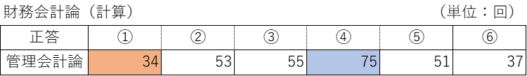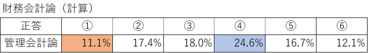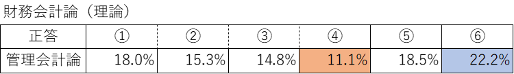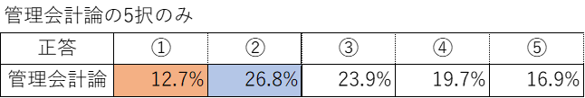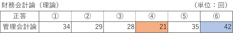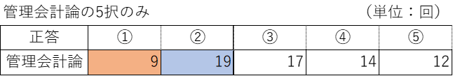 基本的に6択だが、管理会計論については5択の問題もあるため、それについては別途集計を行った。