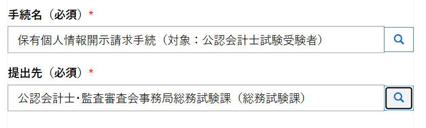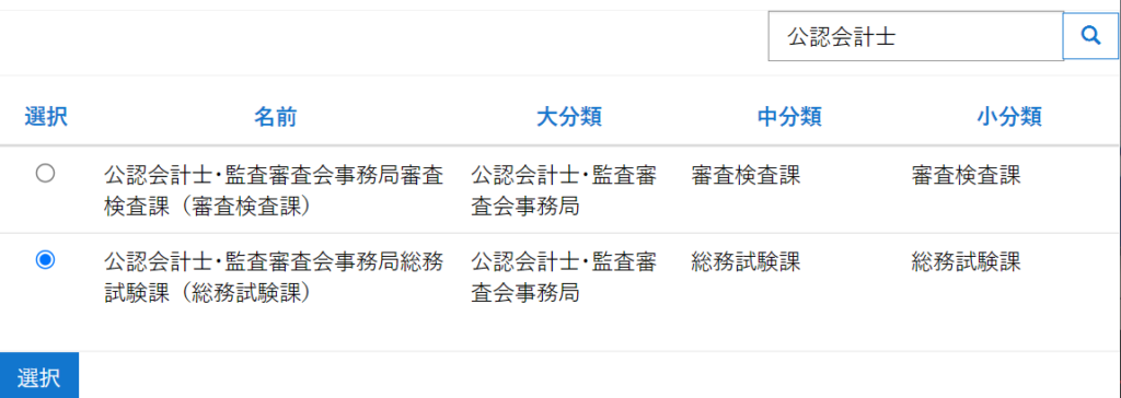 提出名は、以下の通り「公認会計士」と検索すると2つに絞られるため、「総務試験課」の方を選ぶ。