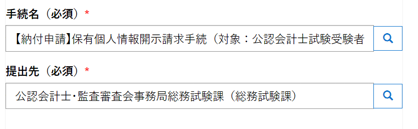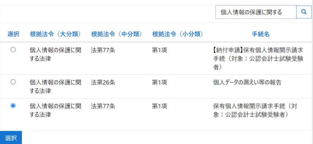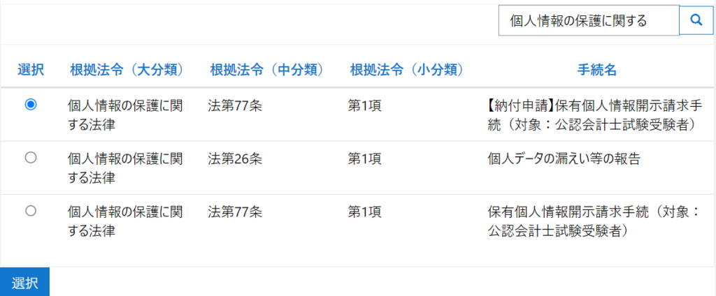 手続名は、以下の通り「個人情報の保護に関する」と検索すると3つに絞られるため、「保有個人情報開示請求手続(対象:公認会計士試験受験者)」と選ぶ。(【納付申請】と書いてある方ではないので注意)
