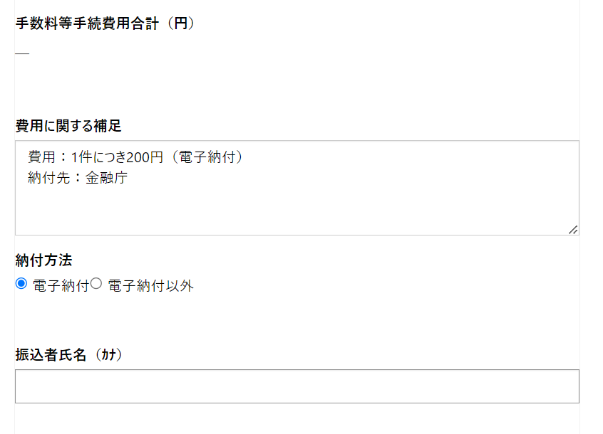 ③の申請が承認されるとメールが届くので今度は金融庁電子申請・届出システムで納付申請を行う。(④の書類が届いてなくても③の申請が承認されていれば、先に納付申請を行うことは可能だった。)