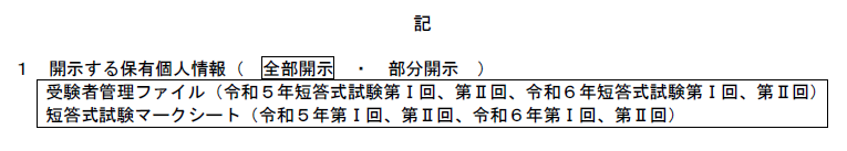リンクより「受験者管理ファイル、論文式試験採点前答案は1年ごとに1件、短答式試験マークシートは1回ごとに1件と数えます。」となっており、以下の画像の場合は、受験者管理ファイルの短答Ⅰ回とⅡ回の2つを開示請求しているが、「1年ごとに1件」ということなので、1件としてカウントする。