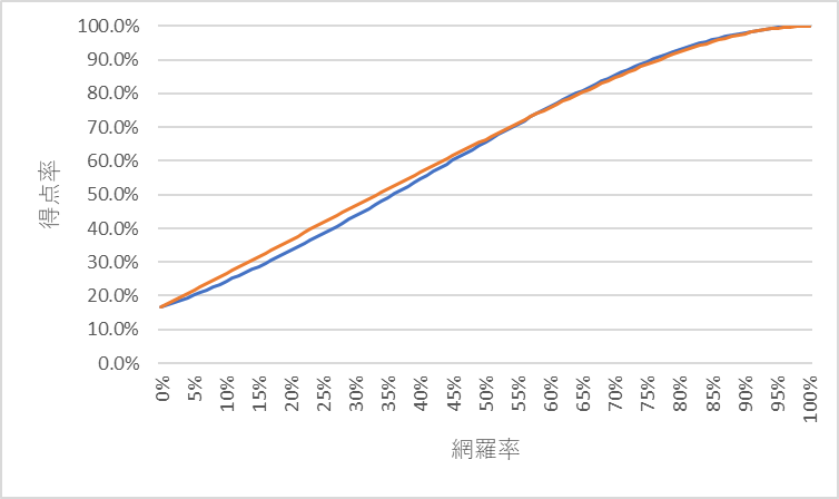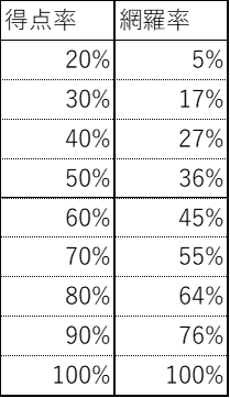 感覚的には得点率70%を確保するためには網羅率70%が必要と考えると思うが、そういうわけではない。