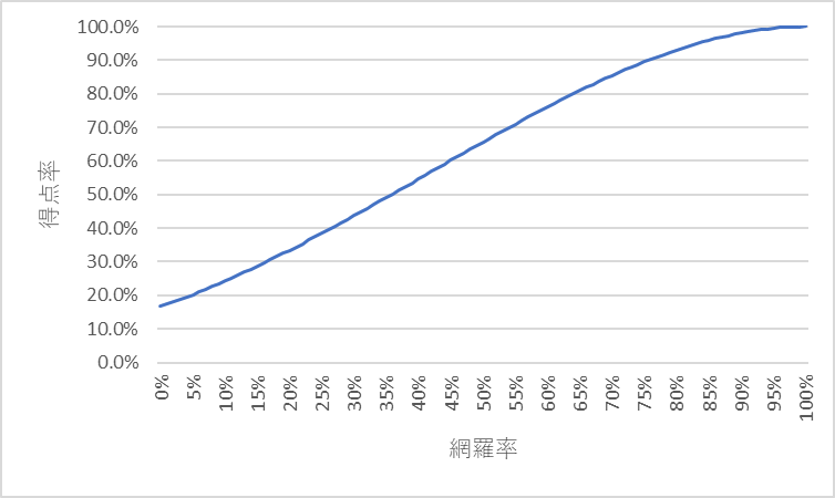 例えば、網羅率が0%の場合、何も学習していないということなので、すべて勘で解答することになり、6択のうちランダムで1択選ぶこととなるため、正解率は1/6(≒16.7%)となる。それが得点率の期待値となる。