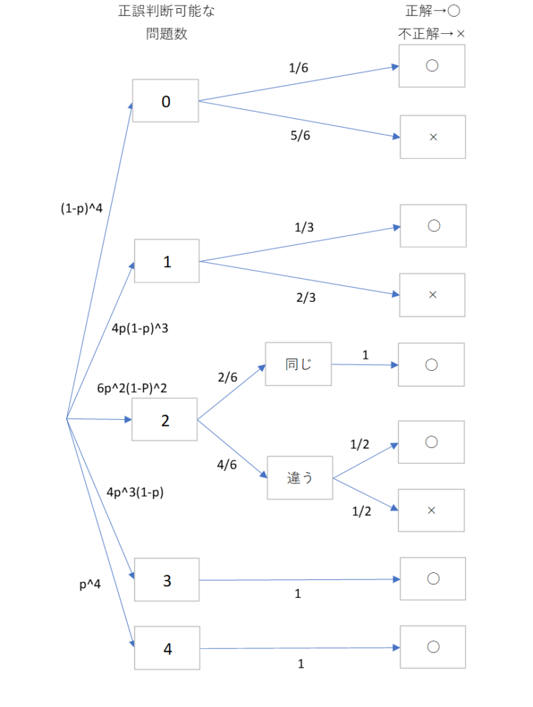正誤判断可能な問題数が2問のとき、「同じ」「違う」で分岐しているが、これは正誤判断可能な問題2問について、両問とも正または誤であれば「同じ」であり、片方の問題が正でもう片方が誤であれば「違う」と分類している。